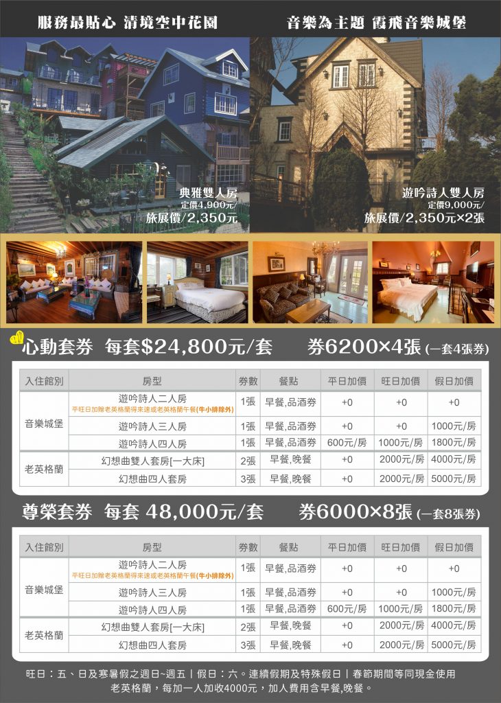 03 11 月 2025 svilla 在〈2025ITF 線上旅展〉中留言功能已關閉 最新消息 Permalink 2025ITF 線上旅展 ✨ 霞飛音樂城堡 住宿券,2張NT2350券起就Check in 🎶 情侶的浪漫之選 ❤️🌹 2張NT2350券元 浪漫遊吟詩人2人房 🎶 親子旅遊,幸福滿滿! 👨👩👧👦💕 1張NT6000券起+600元 享受美好的遊吟詩人4人房 點我購買